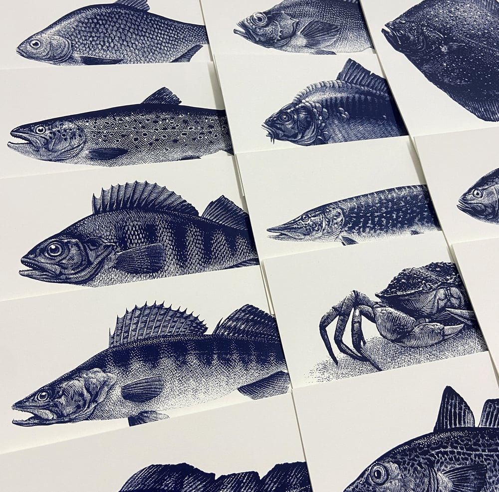 Einfarbiger Siebdruck (Dunkelblau) auf 300 g/m² Designpapier im Format 10,5 x 21 cm, bzw. 17,5 x 17,5 cm.